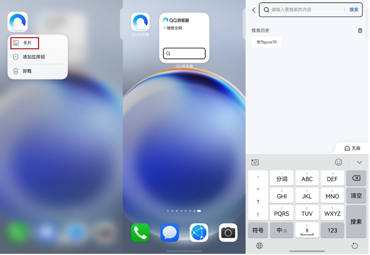 以前在安卓、iOS的浏览器里搜索内容,得先进入浏览器、找到搜索框再输入问题,要是之前网页没关,还得重新开空白页,实在太麻烦了。但鸿蒙原生版QQ浏览器适配了原生鸿蒙服务卡片,长按应用图标选择“卡片”即可添加到桌面,一键就能拉起全网搜索,“两步变一步”,便捷又高效!