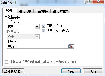 那么像性别这样的文字类信息呢?可以在“允许”部分,选择“序列”,来源部分写上“男,女,”,注意逗号为英文半角。另外确认“序列”右侧“提供下拉箭头”为勾选状态。