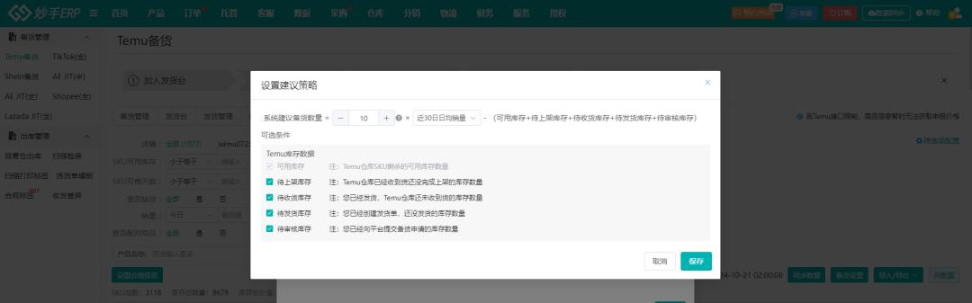 关于备货数量,卖家朋友可以直接在妙手-【托管】模块-TEMU备货-备货设置中,开启建议备货数,并根据公式自定义设置备货策略。