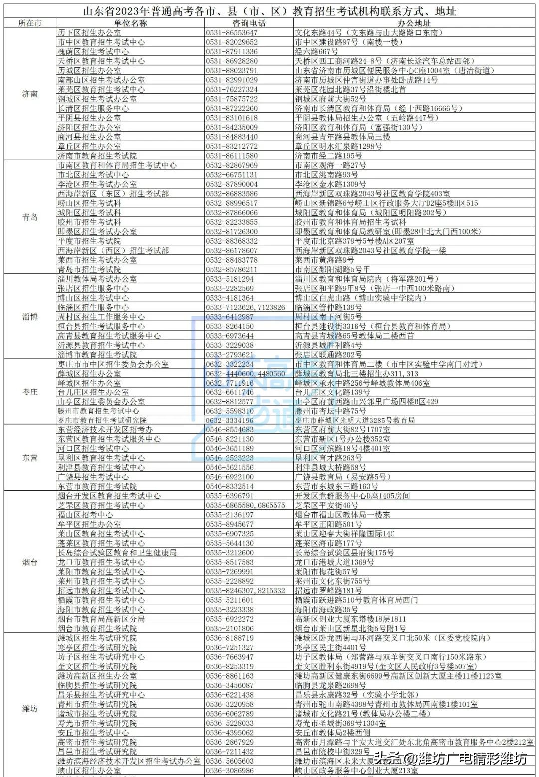 山东省2023年普通高考各市、县(市、区)教育招生考试机构联系方式、地址如下: