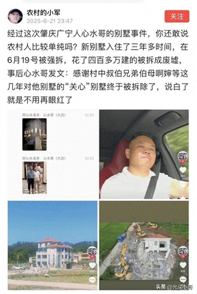 广东肇庆汽车网红心水哥是一名在二手车领域打拼出一片天地的网红,凭借互联网和自身努力,这几年积累了大量财富。和大多数中国人一样,事业有成了,就想着回乡建房。大概在2022年左右,心水哥的豪华别墅建成并入住了进去,到别墅被拆,之间相隔了三年,本意是衣锦还乡,让家人过上更好的生活。入住别墅三年之后,这座别墅在2025年6月19日被拆除。而之所以他家这栋别墅被拆,就是因为违建,手续不齐,被当地群众多次信访举报。最终,一座承载着荣耀与梦想,耗费大量心血与400万资金建成的别墅,在短短数年间就化为一片废墟。