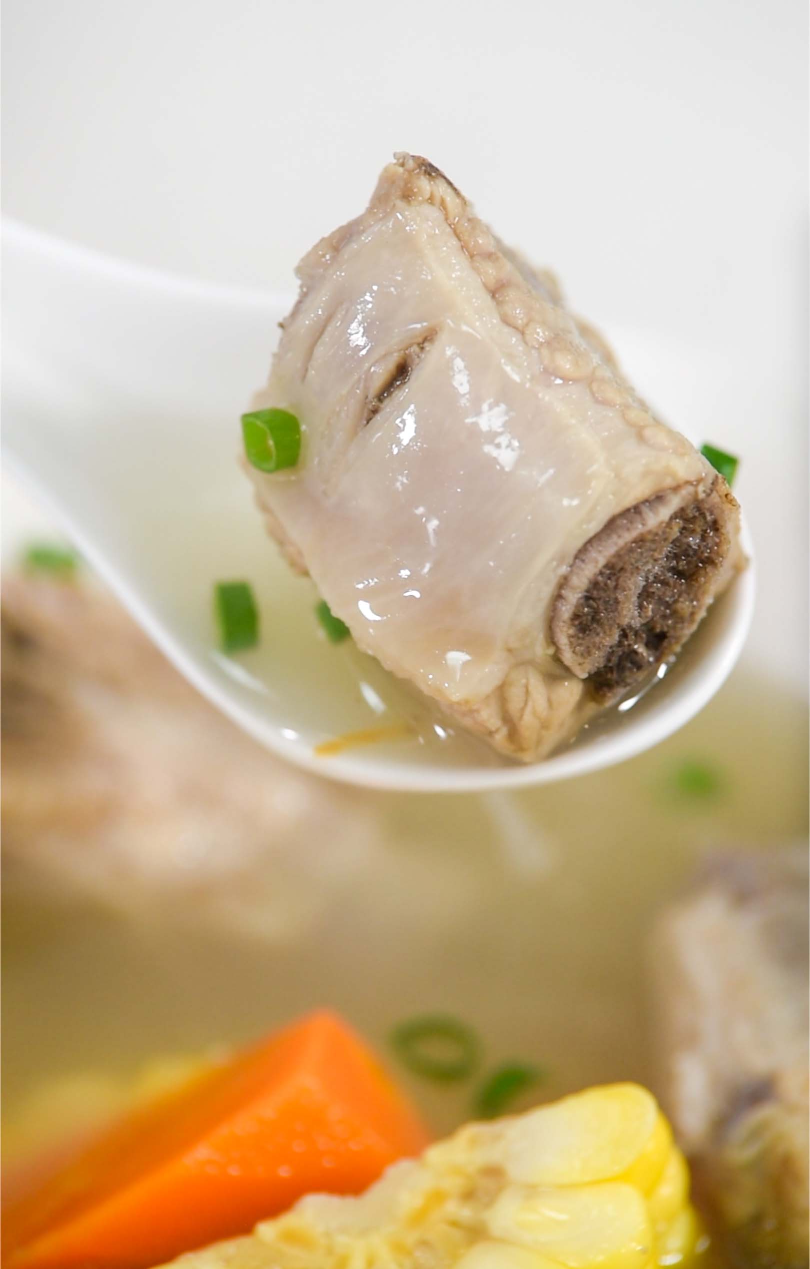 3 玉米和胡萝卜尽量在提前备好,当然在排骨熬制过程中准备也可以,尽可能将玉米切制小块儿,以配合胡萝卜,使之几乎能同时成熟,这些食材都是在排骨熬制一小时后放置的,这一点一定要切记。