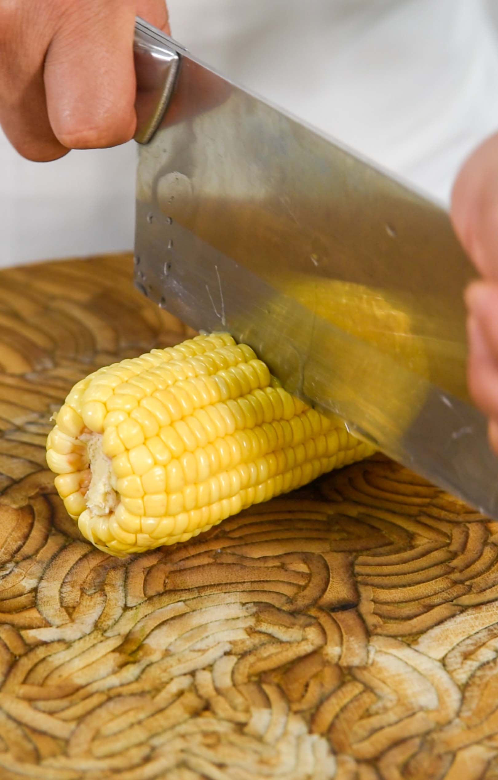 在此期间,将120克玉米切段,再将每一份竖着切成三等份,