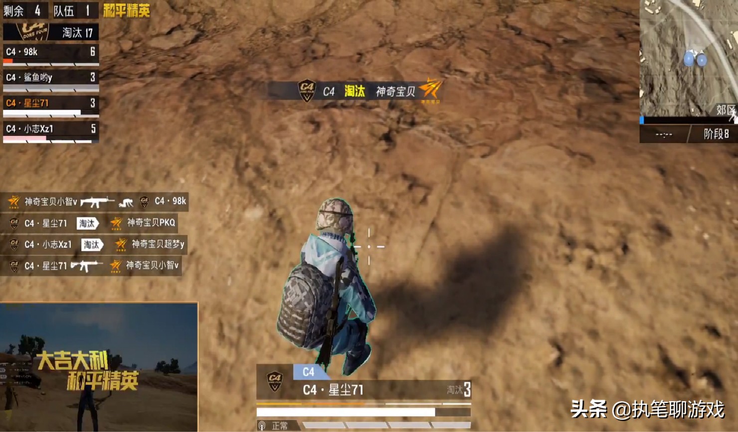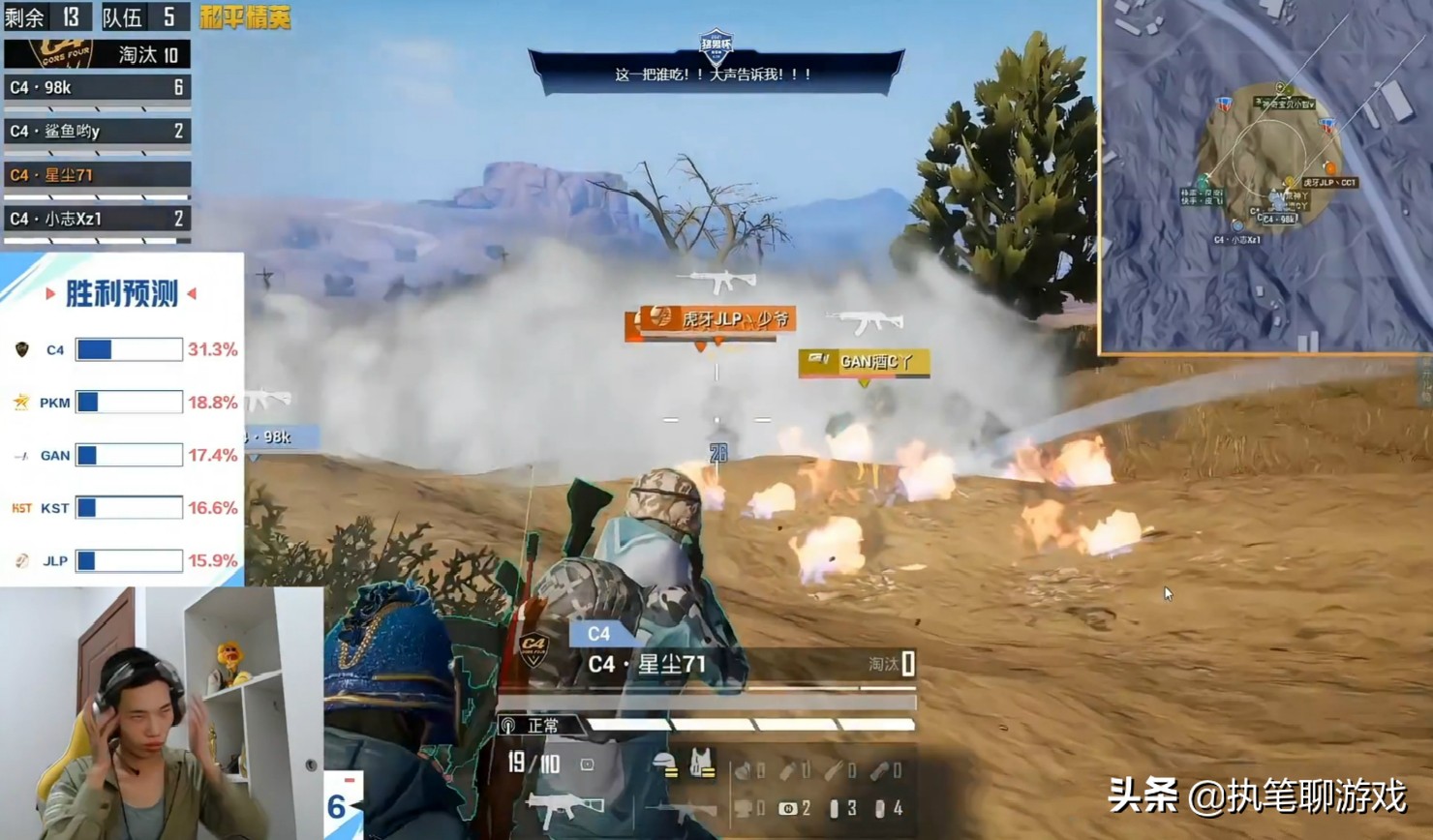 这局比赛里的C4,并没有像此前一样“扛毒苟分”,而是“野区发育”,并以满编的状态进入最终决赛圈,凭借“占点卡位”的战术淘汰17个敌人拿下胜利。