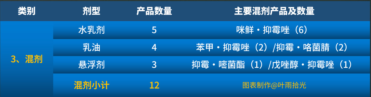 ③用于田间喷雾时,抑霉唑除了单独使用以外,还可以与其他杀菌剂混配,防治病害的效果也会大大提升,常见的混配方案有,与咪鲜胺、咯菌腈、苯醚甲环唑、嘧菌酯等的混配,这几种成分我们之前的分享都有讲过,想详细了解的可以再翻看一下往期的分享。