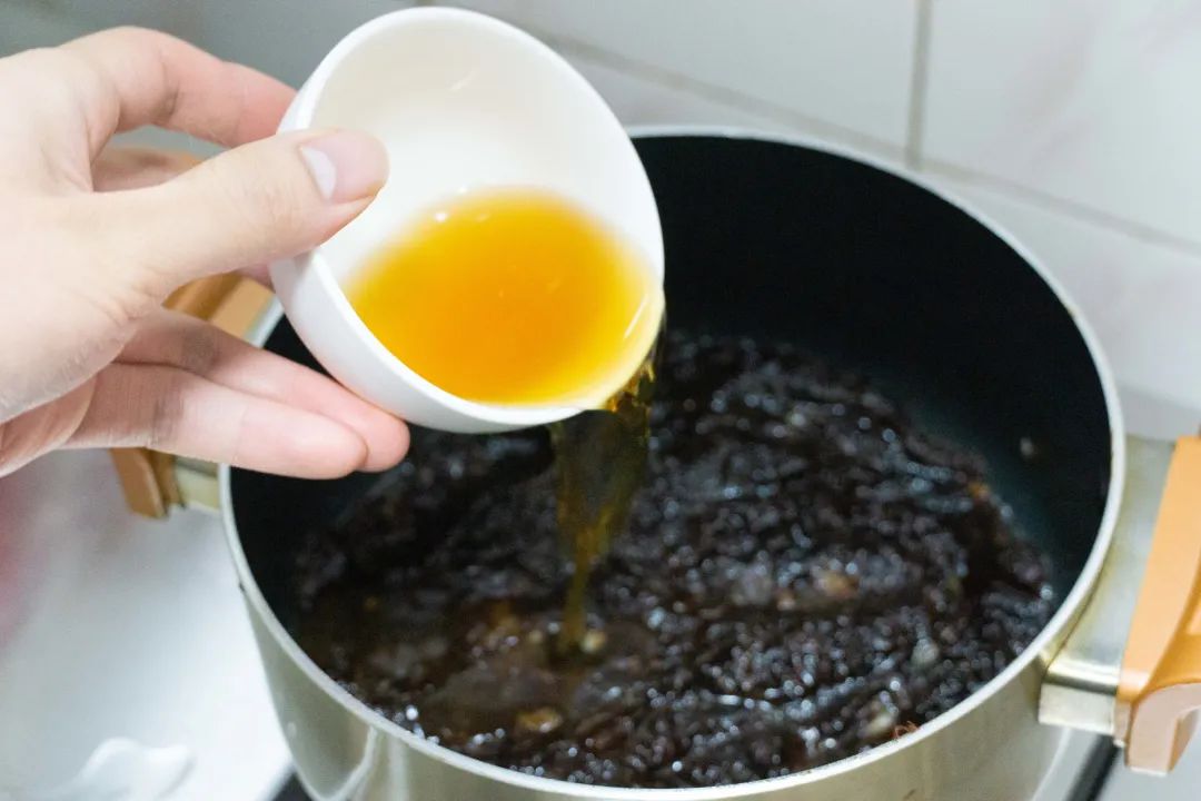 中小火慢慢把酱料炒出香味,从锅边淋入花雕酒,继续翻炒,把酒精全部挥发掉。炒的过程如果发现轻微粘锅,可以加50ml卤水进去,烧开后刮一下粘锅的地方,应该可以刮下来。炒到香气浓郁就可以停止,把柱侯酱倒出来放凉就可以,不能留在锅里,避免持续加热导致柱侯酱变焦。