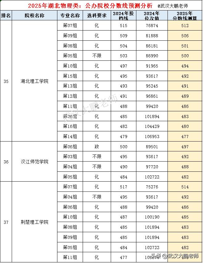 大鹏老师根据2024年的湖北省内本科院校的分数线、位次值,并结合2025年分数线位次进行测算分析。