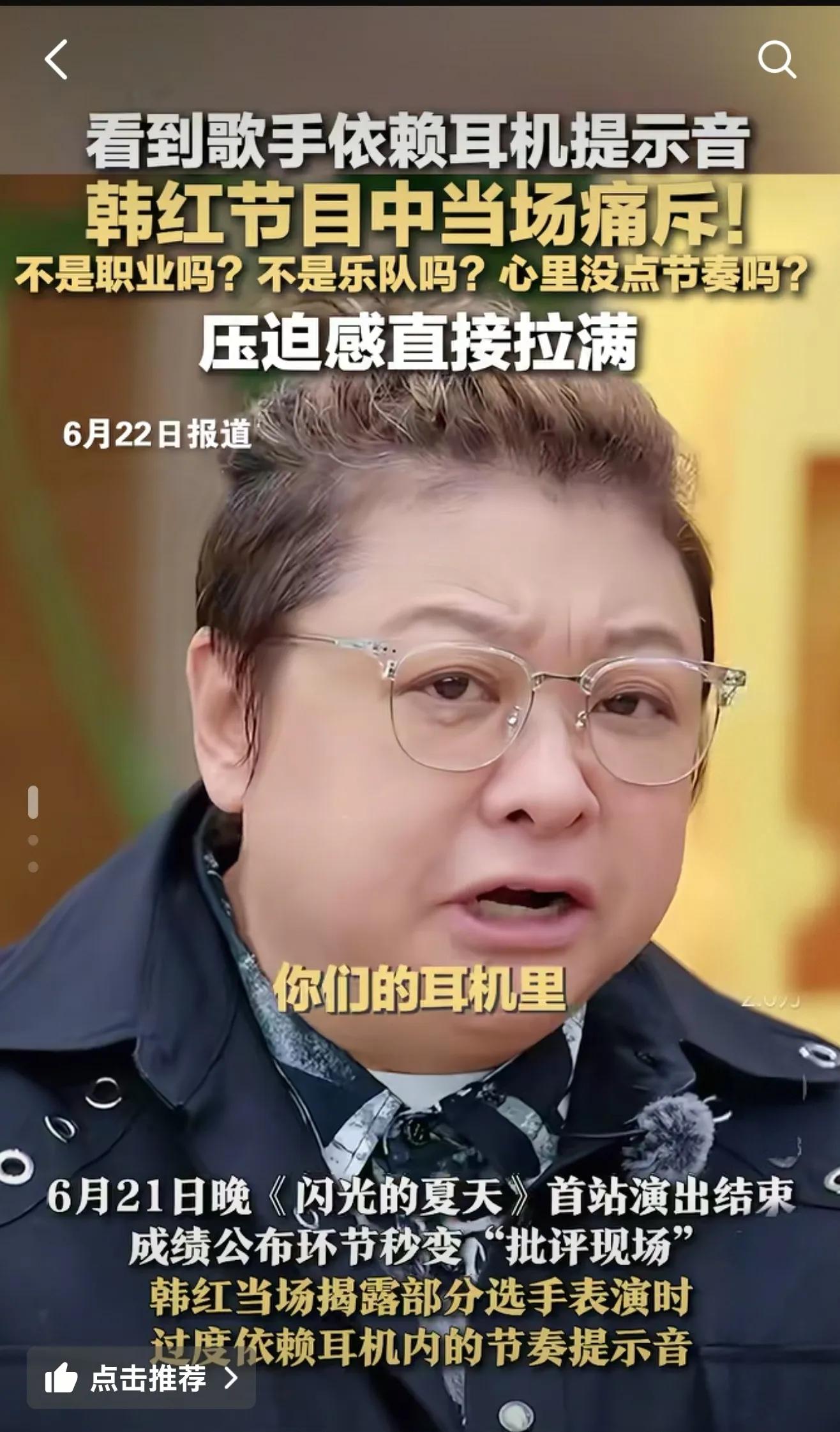 这火爆的一幕,发生在《闪光的夏天》的首演现场。原本该是音乐人凭真本事、拼热血的舞台,硬是被韩红大姐这一嗓子,掀开了藏在耳朵里的“小秘密”。她揪住的,就是如今不少歌手藏在耳返里的“小抄”——节奏提示音。这玩意儿,说好听点叫辅助,说实在点,就像考试时藏在手心的小纸条,精准地告诉歌手“该张嘴了”、“该收声了”,甚至连重拍都在耳边“滴滴”作响。