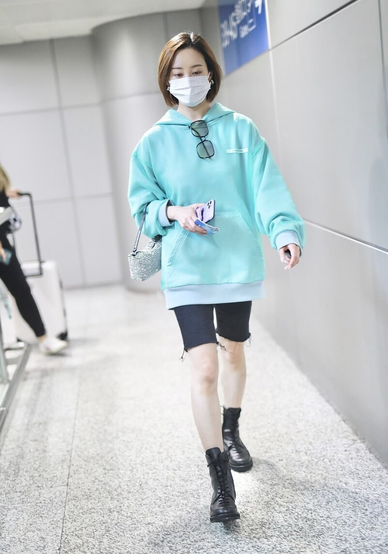 黑色的健美短裤和绿色的卫衣搭配起来很时髦。这组合很适合春天的天气.脚上穿双短靴或小白鞋都不错.五一逛街郊游都蛮美的.