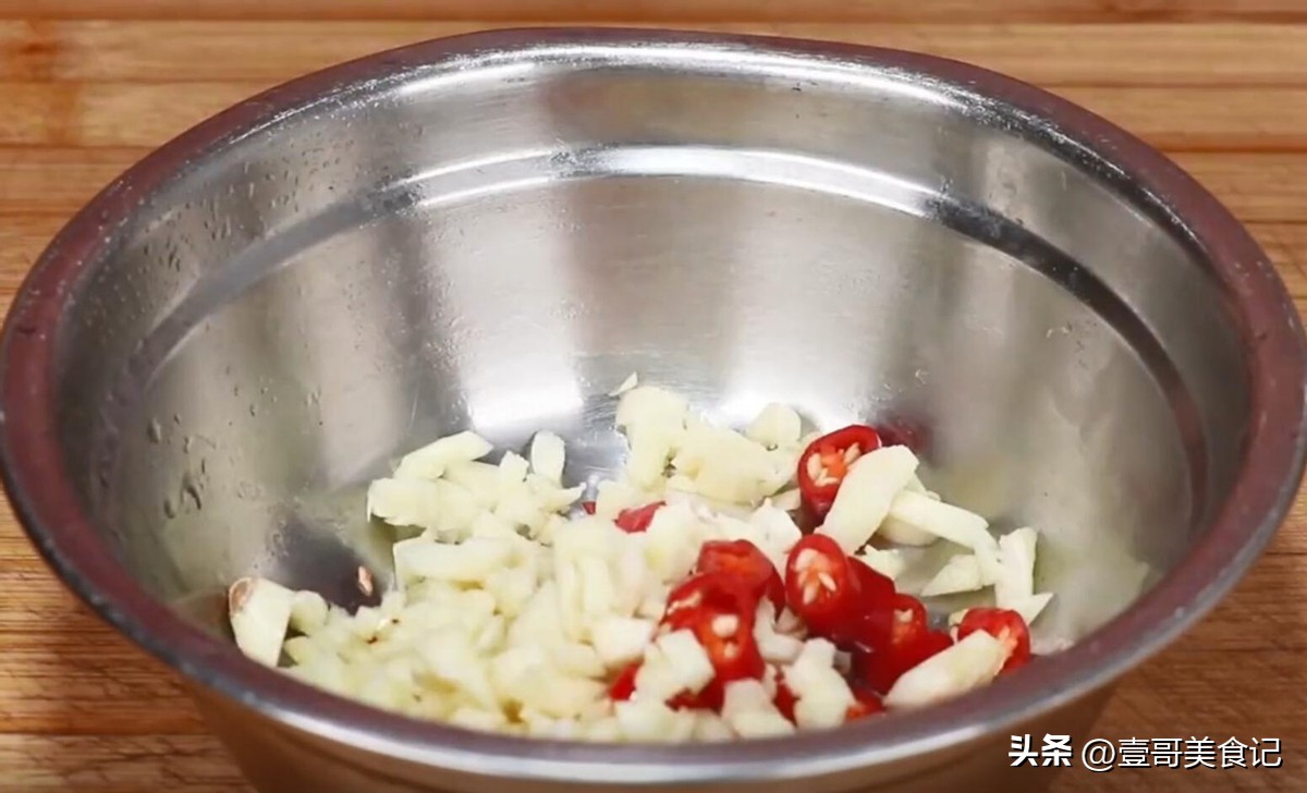 5.再取出几个小米椒,先放进清水中,将小米椒清洗一遍,然后取出来控干水。接着,把小米椒放在案板上,用菜刀将它们的辣椒蒂切掉不要,再把它们摆放整齐,切成细细的辣椒圈。将切好的蒜沫和辣椒圈放进小碗里,待用。