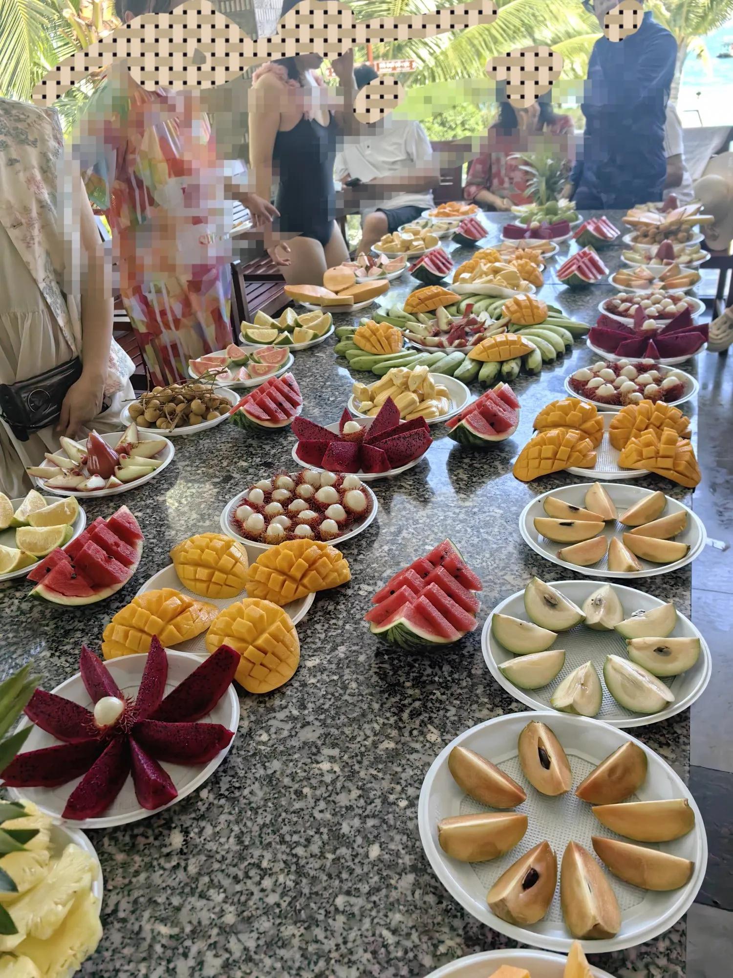 上岸后吃水果宴,行程中带的,品种很丰富,导游开始打感情牌,说是光水果就切了俩小时,给大家安排在最好的位置享用。