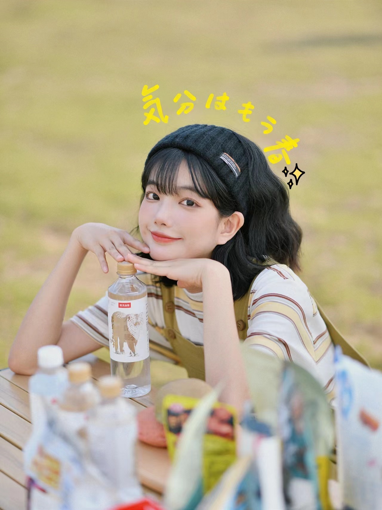 除了吃的东西,喝的东西,同样可以让自己拿着一起摆拍,也能让露营照拍得很好看。