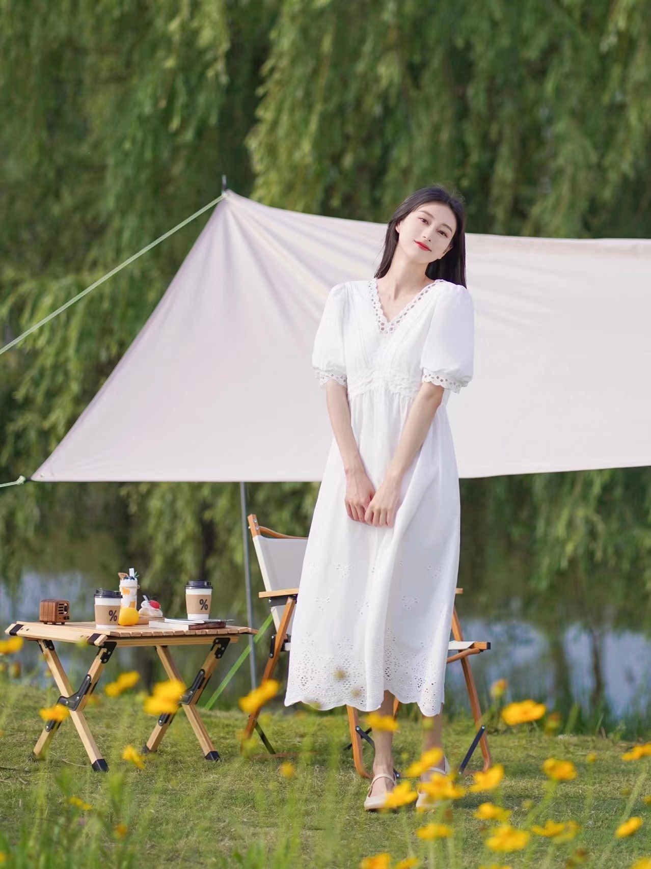 露营拍照,帐篷是必备的道具,太阳太晒的时候,可以让自己躲在搭建好的帐篷底下拍照,拍一半帐篷和草地进去, 人坐在帐篷底下的凳子上,微笑着看着镜头,脚往前伸,这样拍就很自然很美。