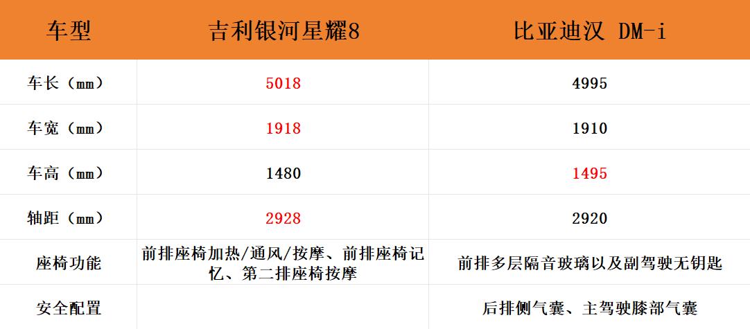 因为是顶配版本,吉利银河星耀8配备了前排座椅加热/通风/按摩、前排座椅记忆以及第二排座椅按摩等舒适性功能,这是比亚迪汉 DM-i低配版本所不具备的。不过,在比亚迪汉 DM-i带有前排多层隔音玻璃以及副驾驶无钥匙进入,在安全性方面也多出了后排侧气囊以及主驾驶膝部气囊。
