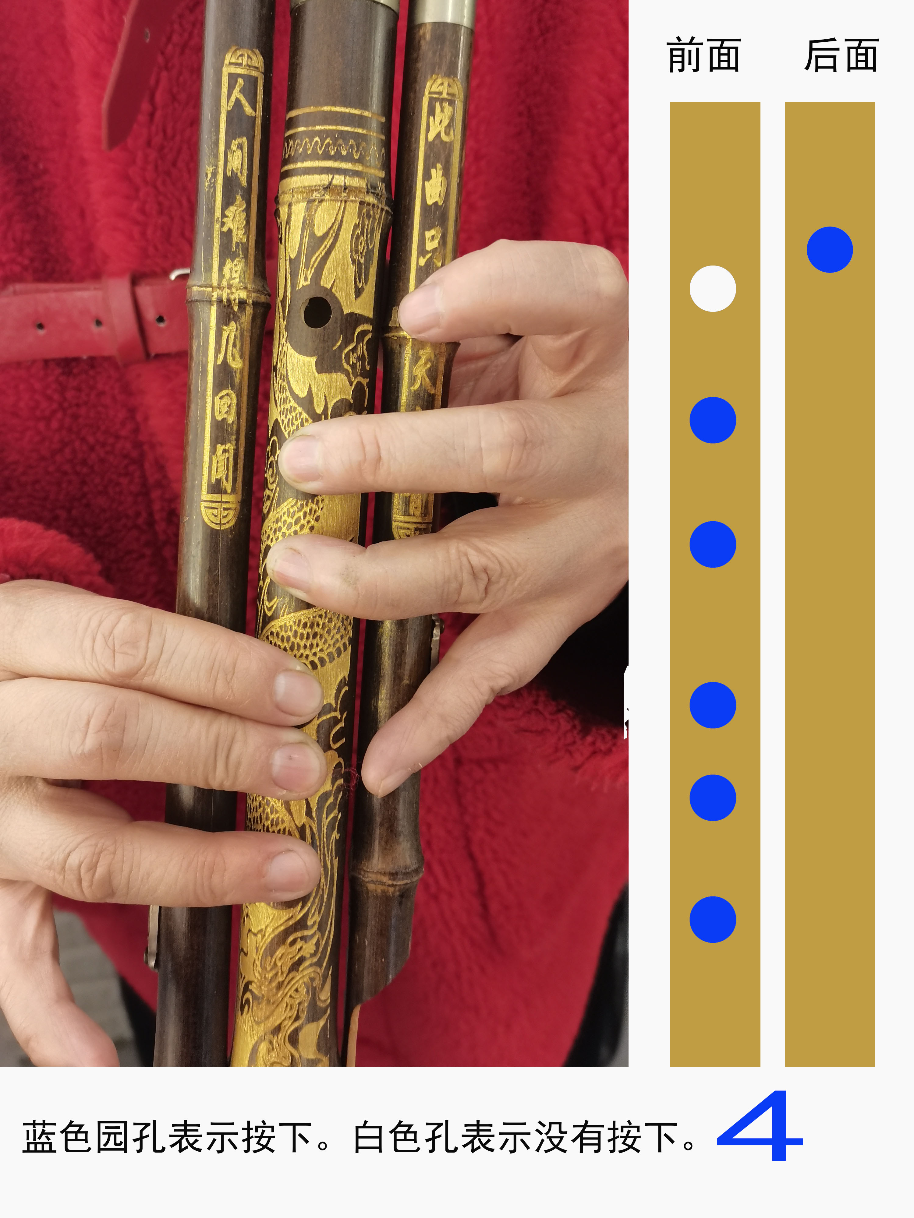 3、全按为4的指法按键示意图和吹法说明