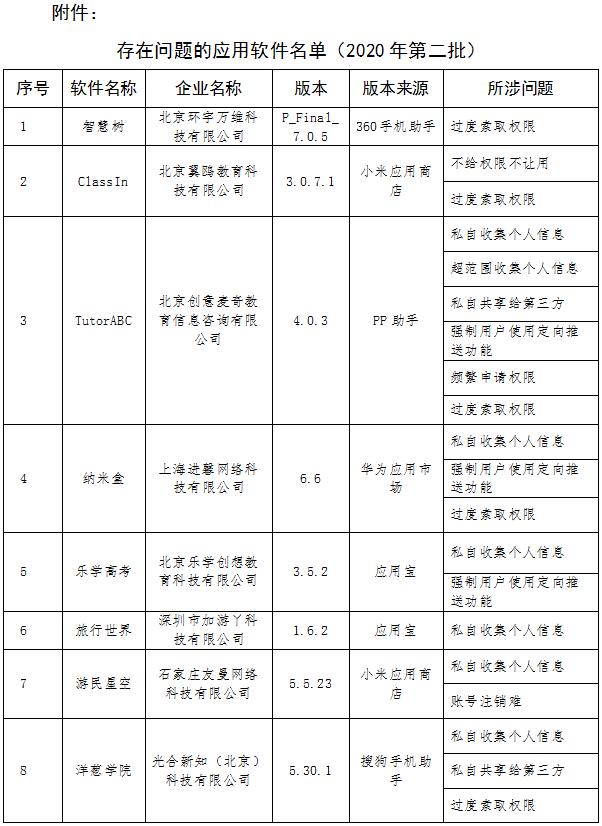 据了解,2019年12月19日,工信部也曾发布存在问题的应用软件名单(第一批),其中,学霸君1对1、智学网、互动作业帮等教育类APP上榜。2020年1月,在工信部公布的第二批存在问题的应用软件名单中,知米背单词、金程网校旗舰版也被要求整改。