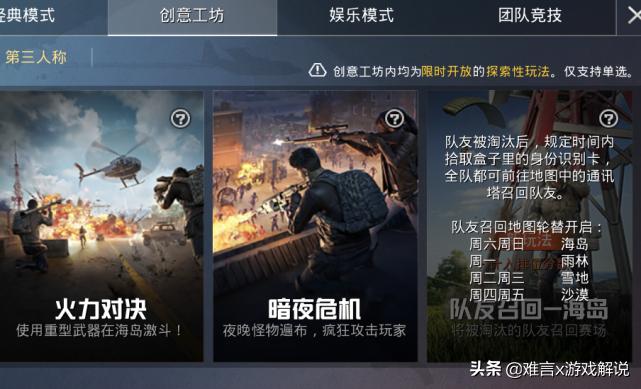 但在新版本更新后,队友召回模式开启了新地图轮换机制,周一匹配的雨林图,周二周三则是雪地图,周四和周五是沙漠图,周末两天匹配的就是海岛图,四张经典地图的轮换匹配,也是让队友召回模式的人气再次回升,尤其是在海岛图中,玩家即便是落地成盒,只要还有队友存活,就可以去到较远的信号塔位置召回队友,不用担心会有敌人在信号塔蹲守。