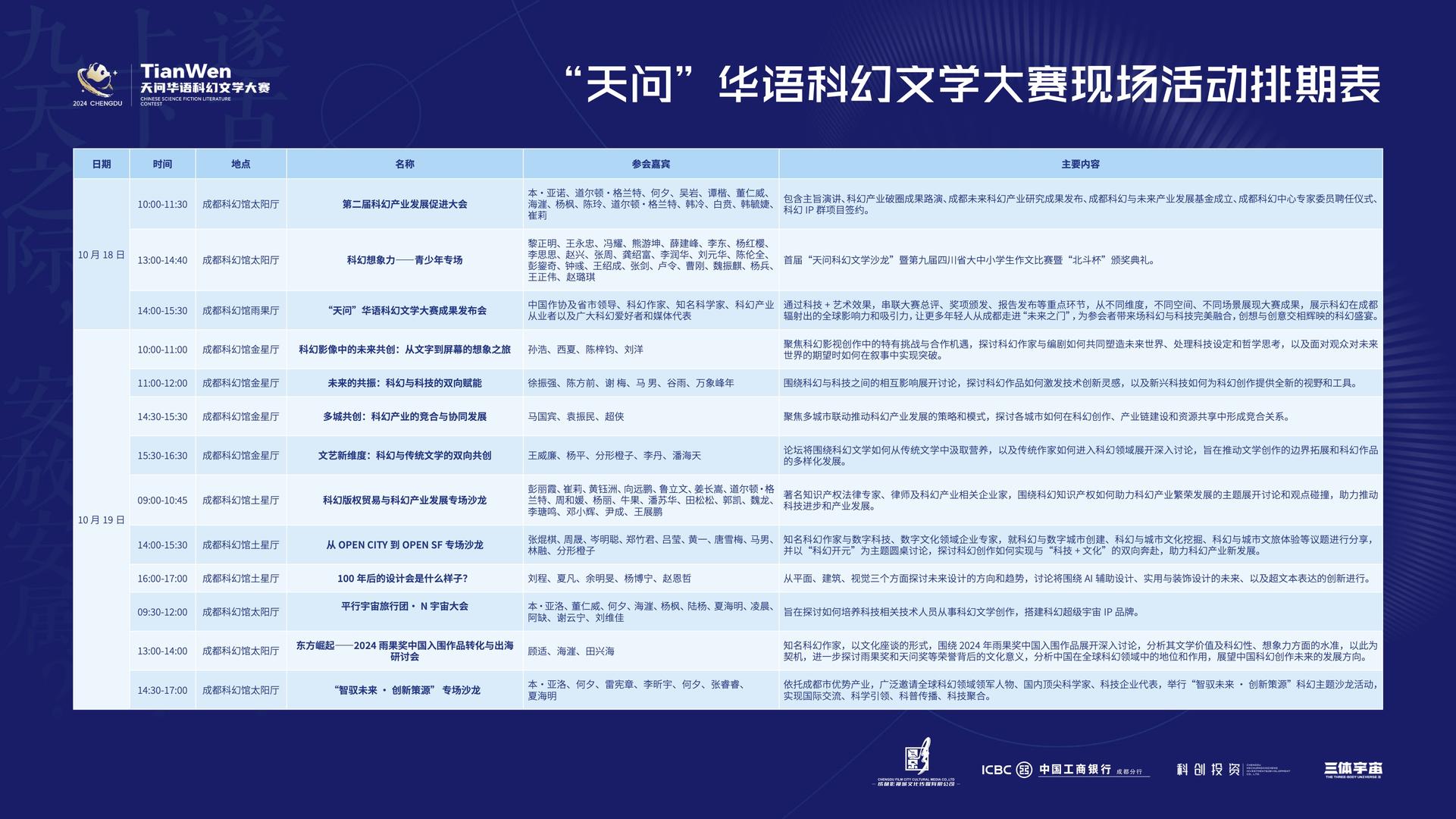 其中最受瞩目的“天问”华语科幻文学大赛成果发布会将于10月18日下午2点在成都科幻馆雨果厅举行。