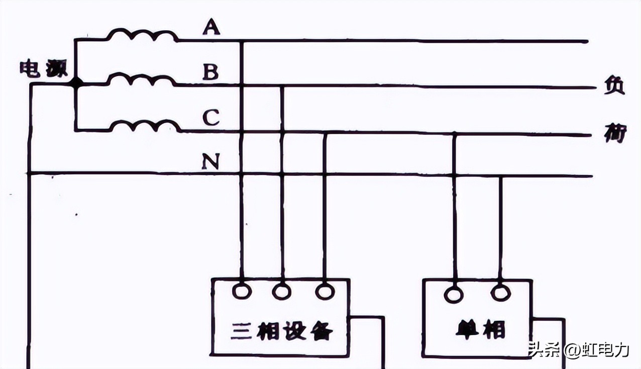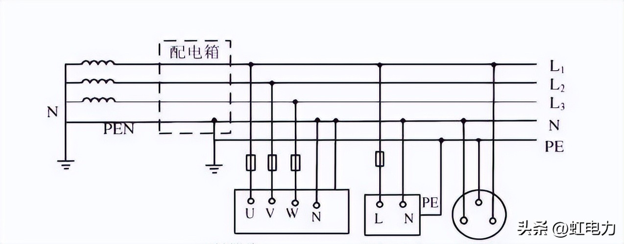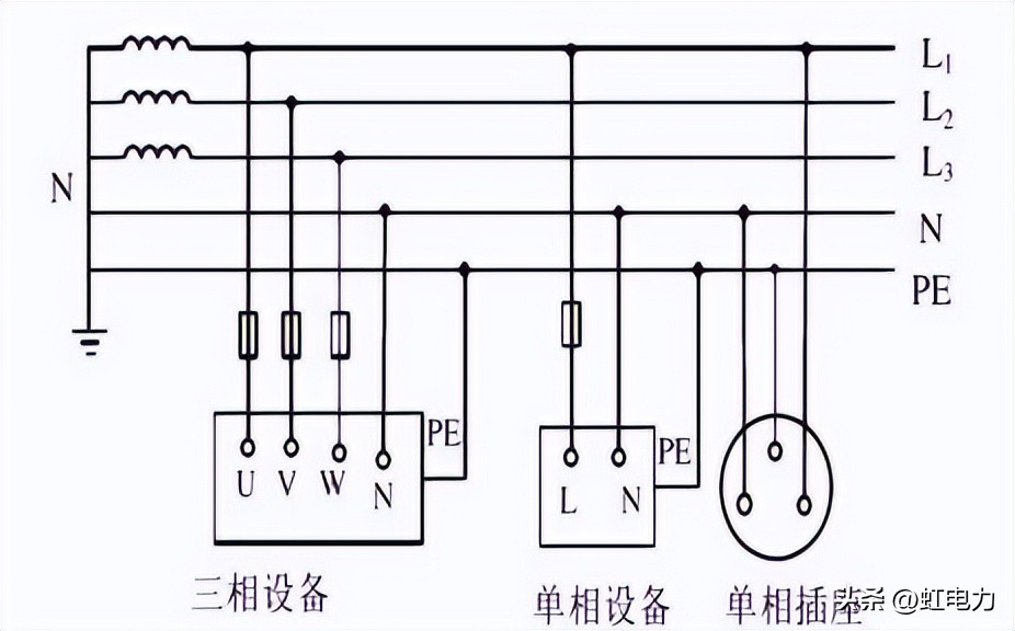 (2)、电源变压器中性点接地,保护零线(PE)与工作零线(N)共用(简称PEN),称为三相四线制系统。其中,中性线(N线)的作用: