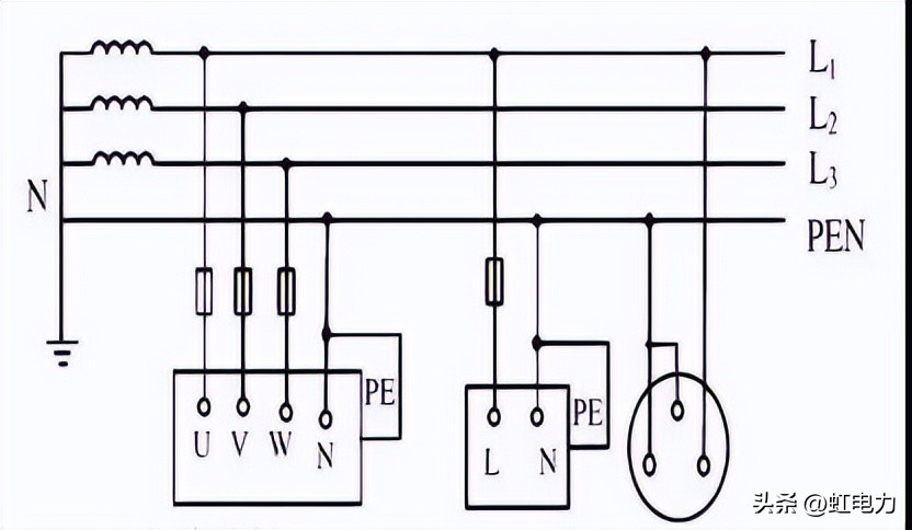 (1)、在TN-C系统中,将PE线和N线的功能综合起来,由一根称为PEN线的导体同时承担两者的功能。在用电设备处,PEN线既连接到负荷中性点上,又连接到设备外露的可导电部分。由于它所固有的技术上的种种弊端,现在已很少采用,尤其是在民用配电中,已基本上不允许采用TN-C系统。