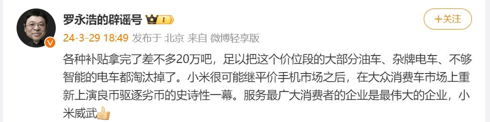 3月29日,罗永浩在微博发文称:“各种补贴拿完了差不多20万吧,足以把这个价位段的大部分油车、杂牌电车、不够智能的电车都淘汰掉了。小米很可能继平价手机市场之后,在大众消费车市场上重新上演良币驱逐劣币的史诗性一幕。服务最广大消费者的企业是最伟大的企业,小米威武。”