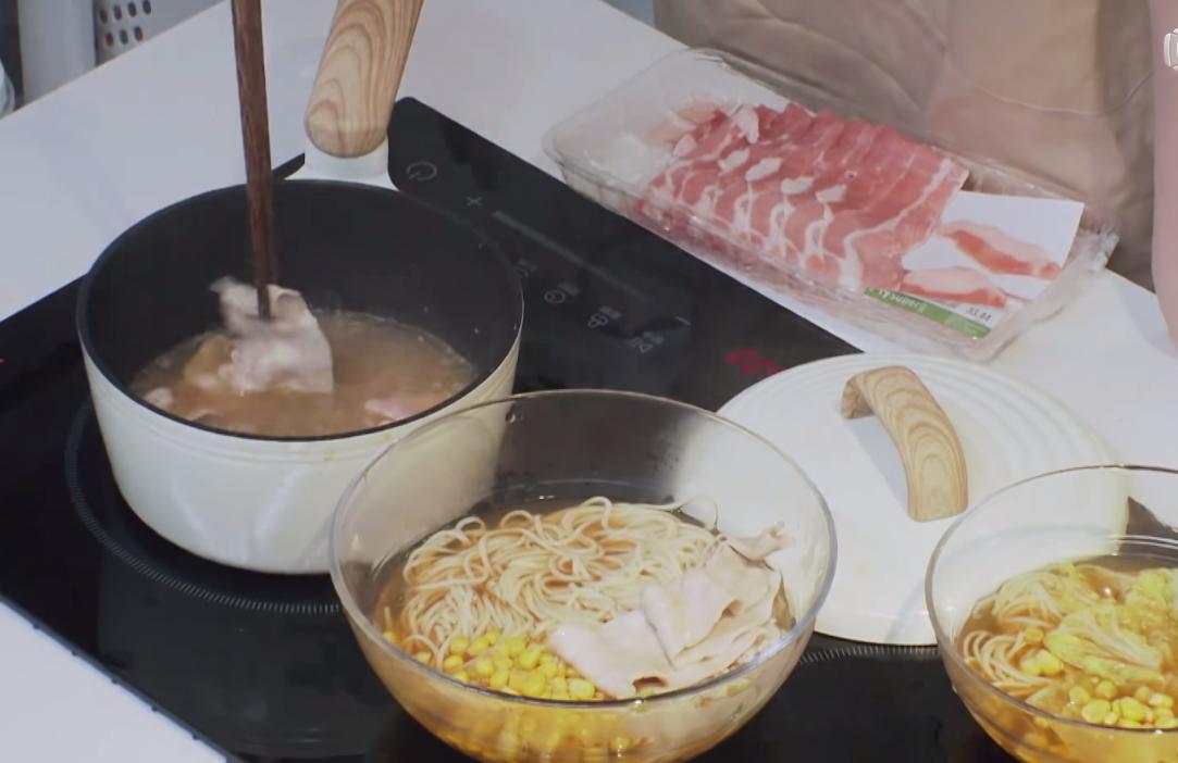 奚梦瑶作为一个超模,她吃得非常清淡,煮面条只放了水煮的青菜、玉米粒、肉片和面条,全程一滴油水都没有。