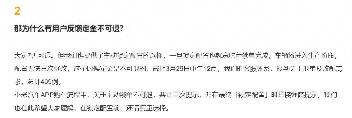 3月29日晚,小米汽车就此进行回应称,大定7天可退。但我们也提供了主动锁定配置的选择,一旦锁定配置也就意味着锁单完成,车辆将进入生产阶段,配置无法再次修改,这个时候定金是不可退的。截止3月29日中午12点,我们的客服体系,接到关于退单及改配需求,总计469例。