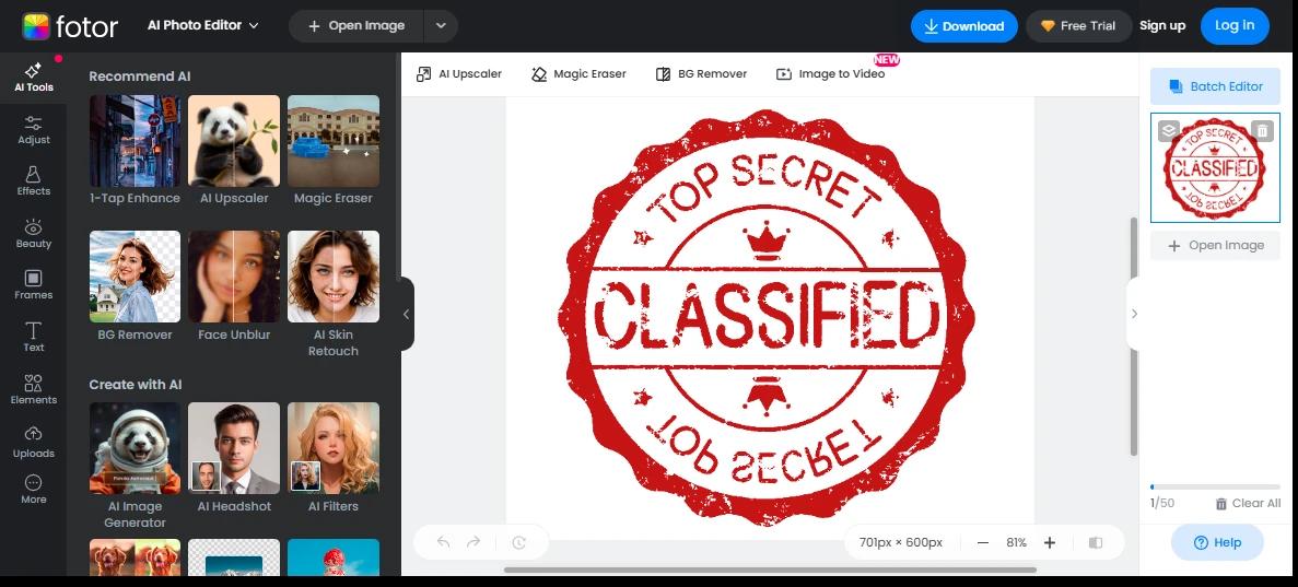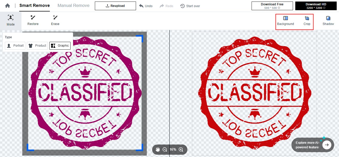 第三步,图片上传后网站开始识别并抠出印章,完成后界面中可以看到透明底的印章,使用左侧的功能,可以优化印章的颜色等。