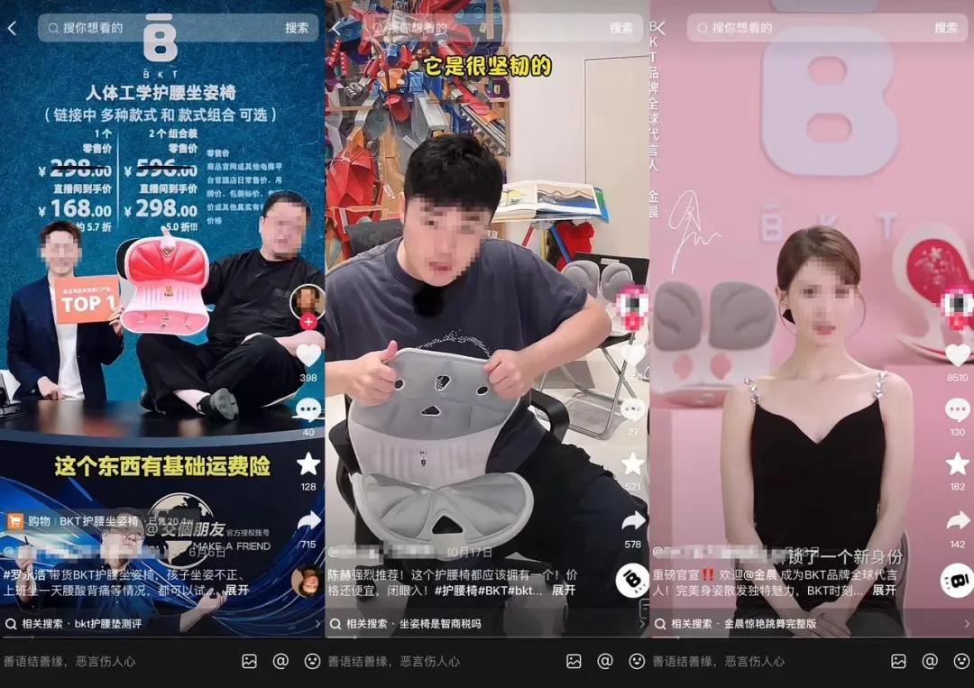 在抖音话题#BKT护腰椅下,孙怡、谢娜、黄奕、陈赫的推荐视频随处可见。