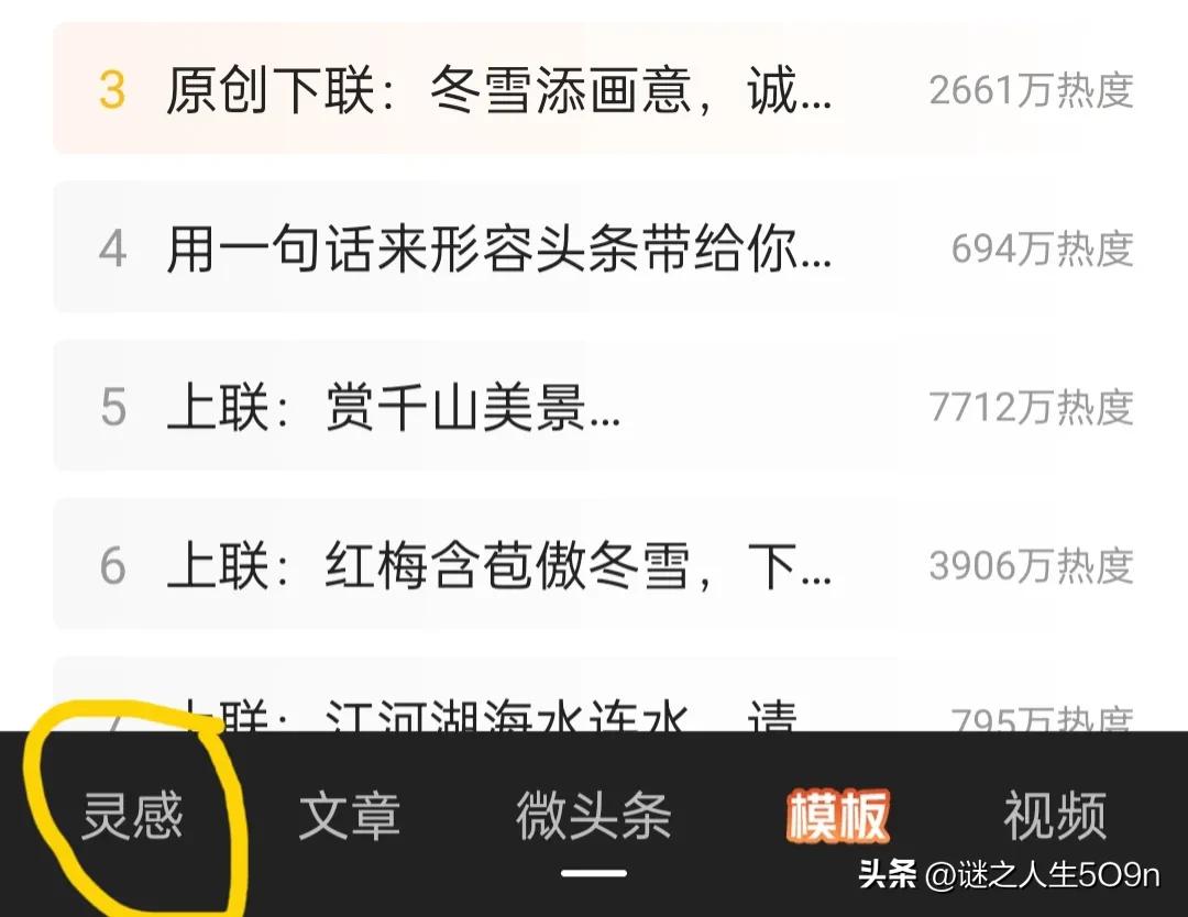 第一步打开头条的App, 点右上角的「+」号,就进入了文章和微头条的页面,在下方就可以看到有一排字灵感、文章、微头条等字样,你就点击「灵感」进入了热聊话题页面。