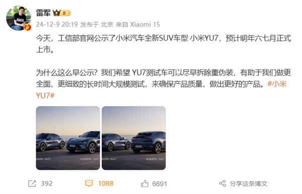 12月9日,小米汽车官方微博晚间宣布,小米汽车新成员小米YU7 SUV登场,新车预计明年六七月份正式上市。