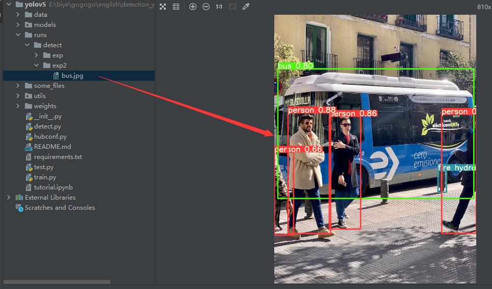 1.python detect.py --source data/images/bus.jpg --weights pretrained/yolov5s.pt |