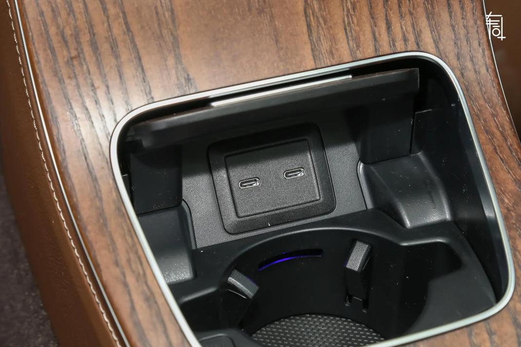 这里的水杯架设计除了增添额外成本之外,也为了弱化突出的地台。保证后排的一致性,但是唯一的不好是,两个Type-C接口在水杯架之内,放置水杯时,线束会同水杯空间产生冲突。