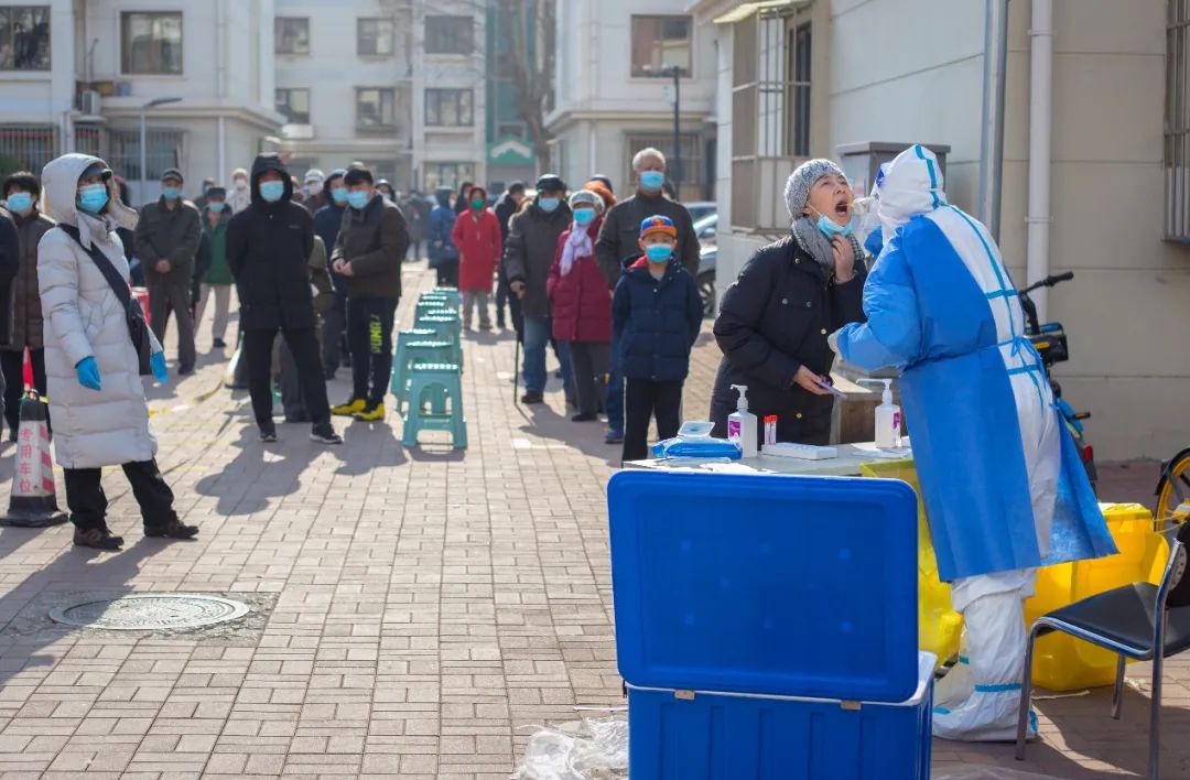 那么用远景、全景的大视角,拍这样的叙事照片可以不可以?当然可以,不然怎么知道现场有多少人?作者的这张照片就用了一个大视角,重点不在于人物的表情,而在于体现这个核酸检测现场的全貌,如果确实是这样的表达,那么就很准确。当然,主体太靠边了点,如果站在主体的身后,以排队的人做背景,可能更艺术一些。