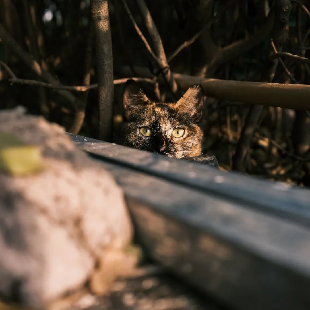 这两张“猫片”,作者都使用了遮挡式的构图技巧,虚化了的前景中只露出猫的头部,就像它们在暗处偷窥人类……这种构图很巧妙地描绘了流浪猫的高度警惕性。“虎视眈眈”的表情抓取得也很到位。