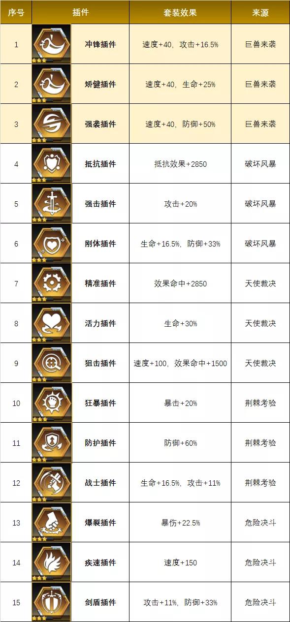 从上图中我们可以看到,全新的3个插件【冲锋插件】、【矫健插件】和【强袭插件】都加入了一个共同的属性速度+40,而另外一个主属性则分别是攻击、生命和防御,其实从这个属性的设置上就能看到策划非常机智的一点,毕竟速度现在在各个副本或是PVP中都是一个抢手属性,理论上回合制的游戏只要手握一速,那么也就意味着掌握了战斗的先机,获胜的可能性也是大大提升,所以在3个新插件中都加入速度属性无疑也是要打这个优势属性的擦边球,不过要说到这3个新插件到底值不值得去努力刷,接着我们还得看看其它插件的属性对比。