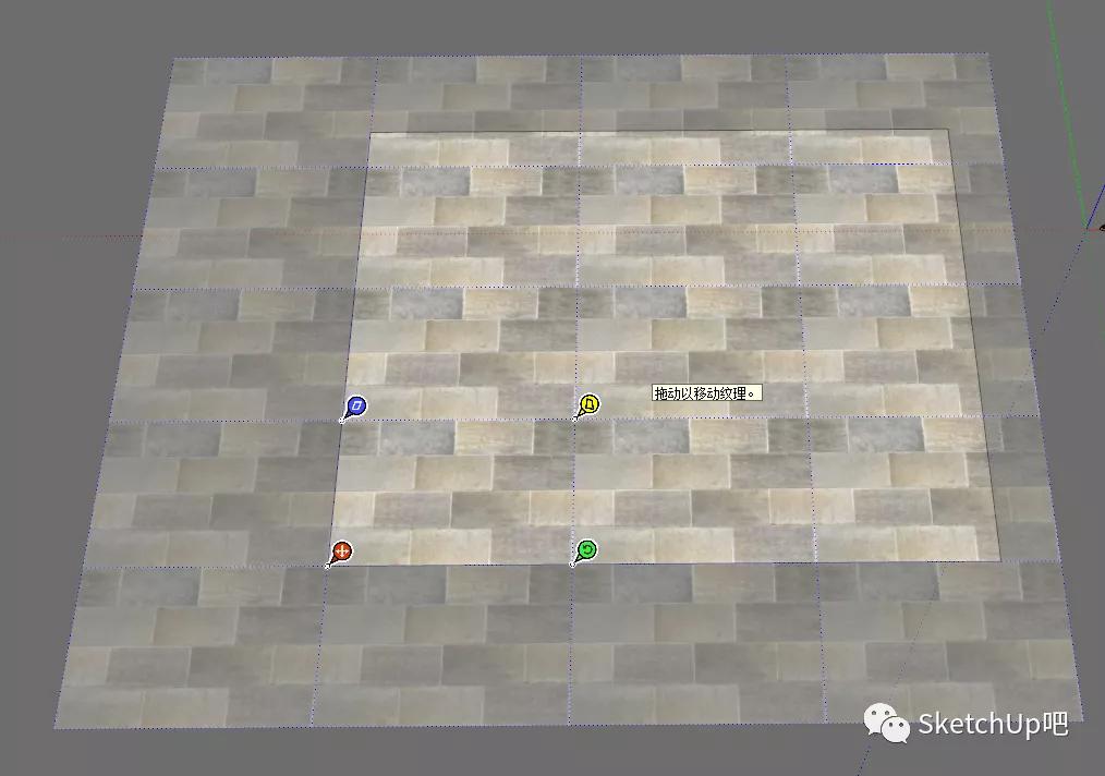 平面上的材质可以通过右键进行纹理调整,红色图钉可以移动纹理的位置,绿色与蓝色图钉可以旋转纹理及调整纹理比例,黄色图钉可以调整贴图的透视关系扭曲贴图。