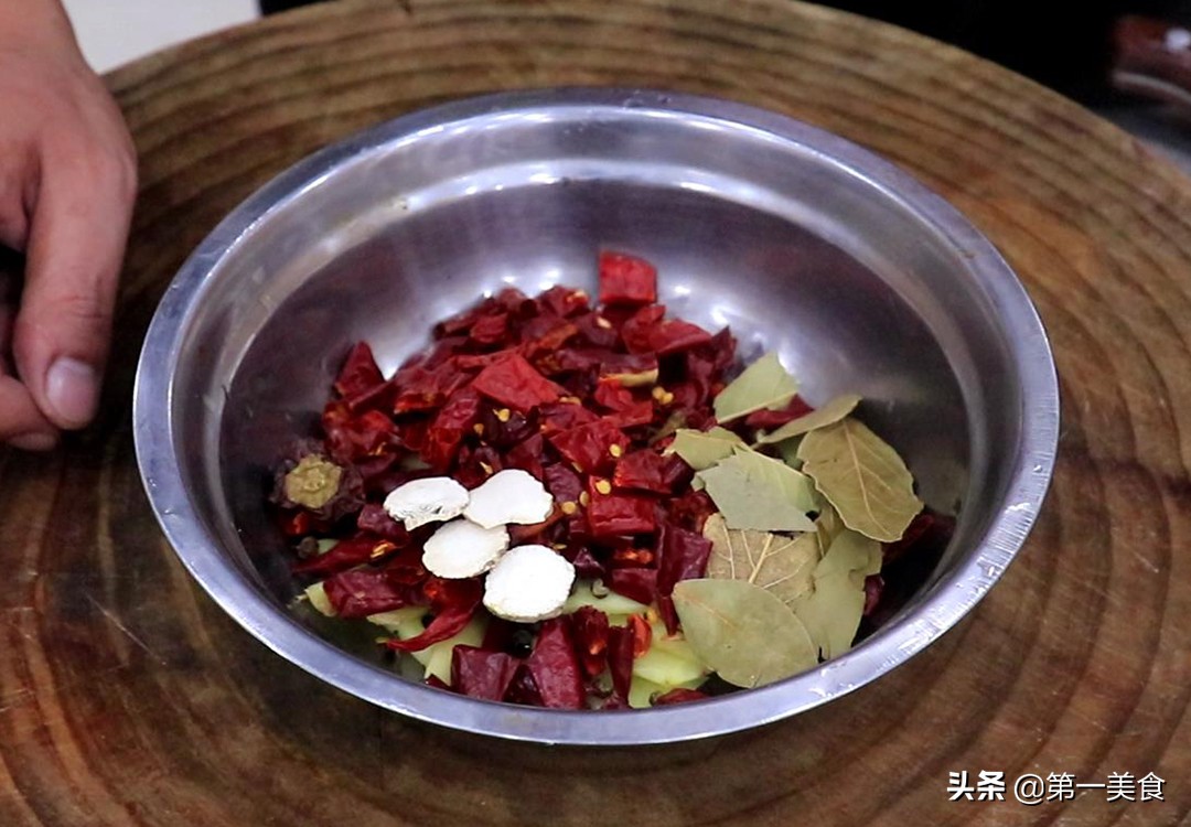 准备生姜一块,切成薄片放入盆中,抓入两粒八角,一小把麻椒,一把干辣椒,几片香叶,几片白芷备用。