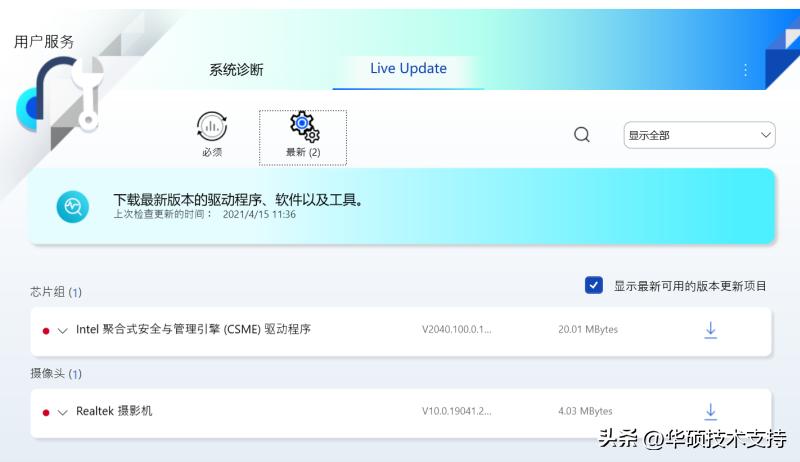 Live Update:可查看电脑驱动程序及应用软件的最新可用版本,可点击下载图标进行下载并安装。