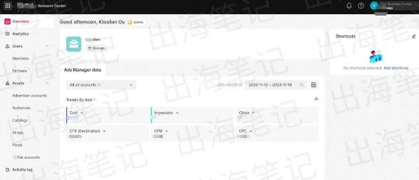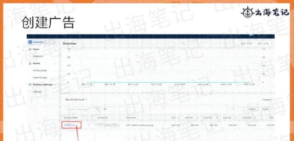 自己去创建报告,自定义报告就好,跟fb自定义报告一样的,在后台的这几个地方。比如说点到overview这里面, 我们可以去进入后台创建广告。那比如说我点这个account name,出海笔记,可以进到创建广告的一个页面。