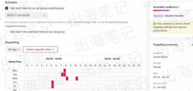 specific time选择晚上的八点到八点开始投,八点到十点半这个时段都勾选。刷抖音一般九点会更好一点,八点也有点早了,可能大家还在吃饭。选九点,这里面只是演示,真正以你们实际操作为主。