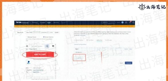点击某个按钮,比如说加进购物车。一般我们都是点击按钮,我们用点击按钮为例, 然后我们选择这个click event,在左边输入购物车的一个URL,然后滚动这里预览,发现这里面浏览有一个add to cart的button。