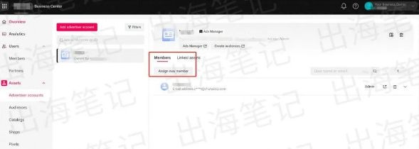 你可以联系你的代理来开这个的team member, 就类似于 fb的facebook的一个business manager, 然后选择AD Account, 这个类似于我这里出海笔记这个account, 你可以设置权限。你要先授权一个管理员来创建广告。