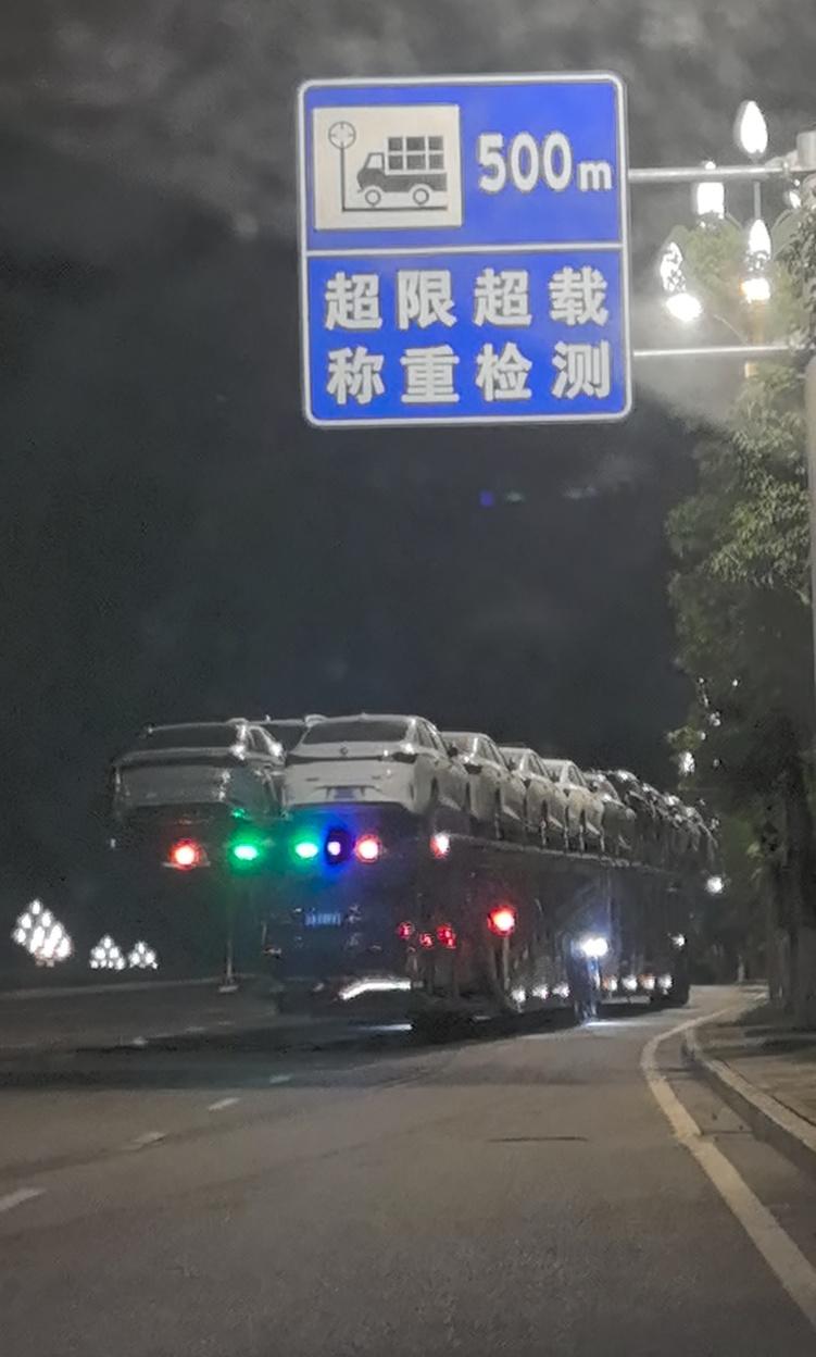 次日凌晨0点15分,这辆“飞机板”抵近重庆绕城高速凤凰收费站。记者一行将车停在路边。在收费站前500米处,“飞机板”突然停车,倒车约百米后停在记者车辆前方。附近道路灯光充足,旁边路牌写着“超限超载 称重检测”。2点55分,另一辆“飞机板”从后方驶来,紧贴记者车辆停放。