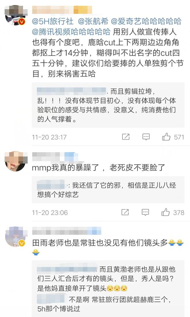 这期节目播出之后,鹿晗粉丝对节目组也有点不满,因为这期节目鹿晗的镜头非常少,只有十几分钟,但新嘉宾张颜齐、王晨艺却有单独的40多分钟,连嘉宾田雨的时长都没有他们多,现在鹿晗和张颜齐他们的粉丝之间也起了一点小摩擦。