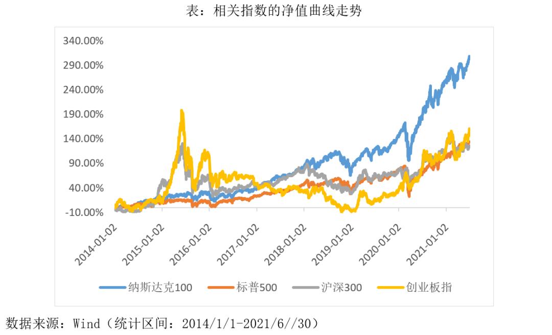 下图展示了纳斯达克100指数和美股、A股主要宽基指数的2014年以来的走势对比。它们的分年度收益和区间年化收益率在之后的表中展示。数据显示,纳指100指数有着更高的年化收益率,较小的波动率,因此具有较高的夏普率。