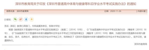 11月25日,深圳市教育局正式印发《深圳市普通高中体育与健康等科目学业水平考试实施办法》(以下简称《深圳市学考实施办法》),明确体育与健康、音乐、美术、信息技术、通用技术5门科目普通高中学业水平考试将从2020年秋季入学的高一新生开始实施,合格率98%以上,主要作为学生普通高中学校毕业和同等学力认定的依据之一。