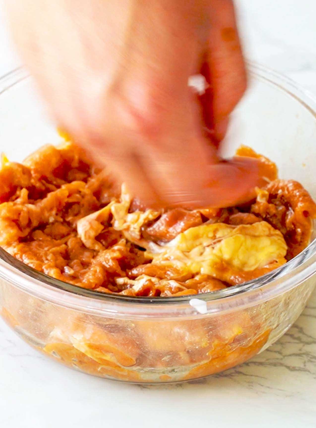 抓拌时要顺着一个方向搅拌,这样便于入味,也不容易把牛肉抓烂。最后加入10克色拉油锁住牛肉的水分,这样牛肉不干不柴更好吃。