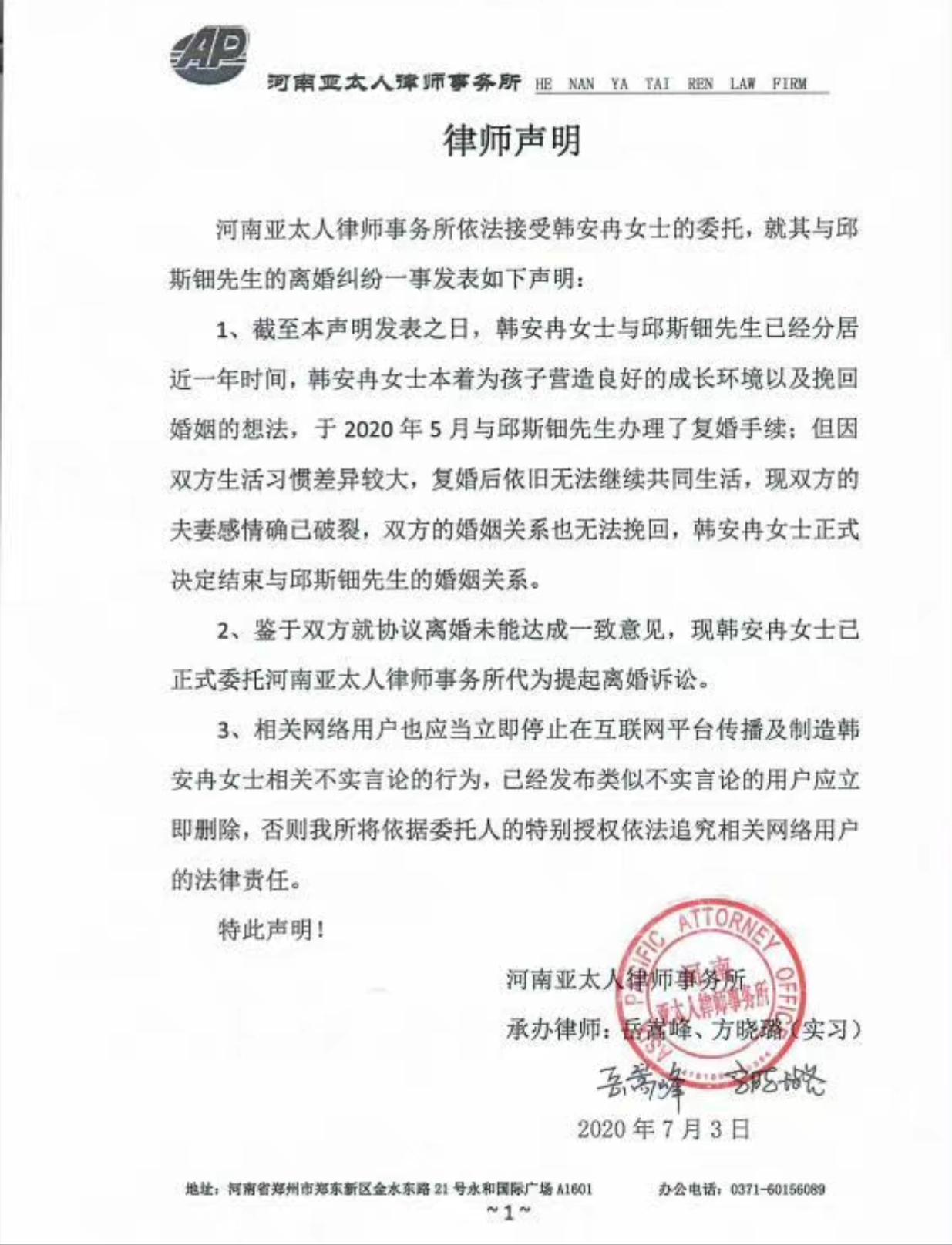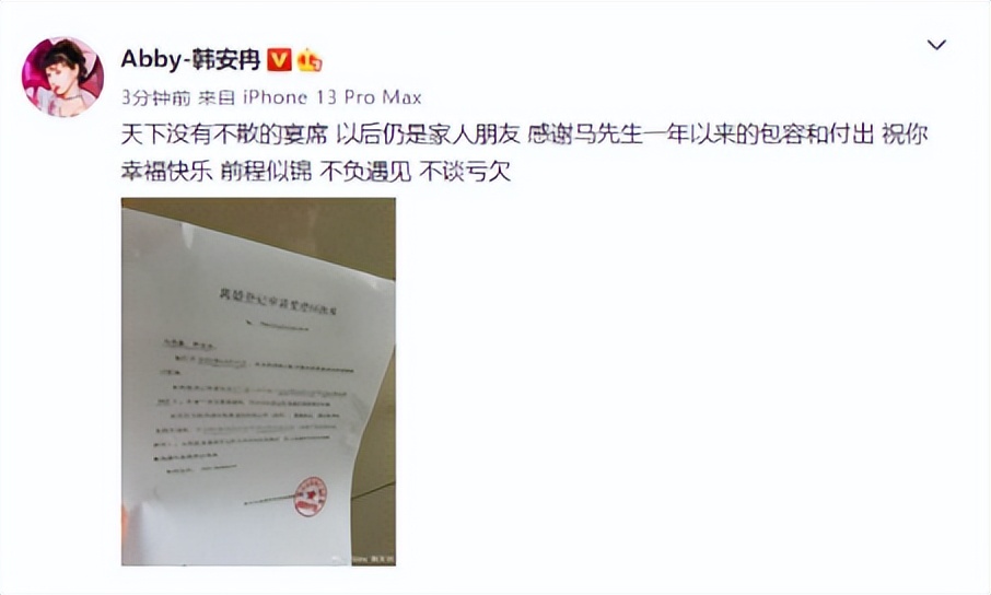 韩安冉的离婚申明