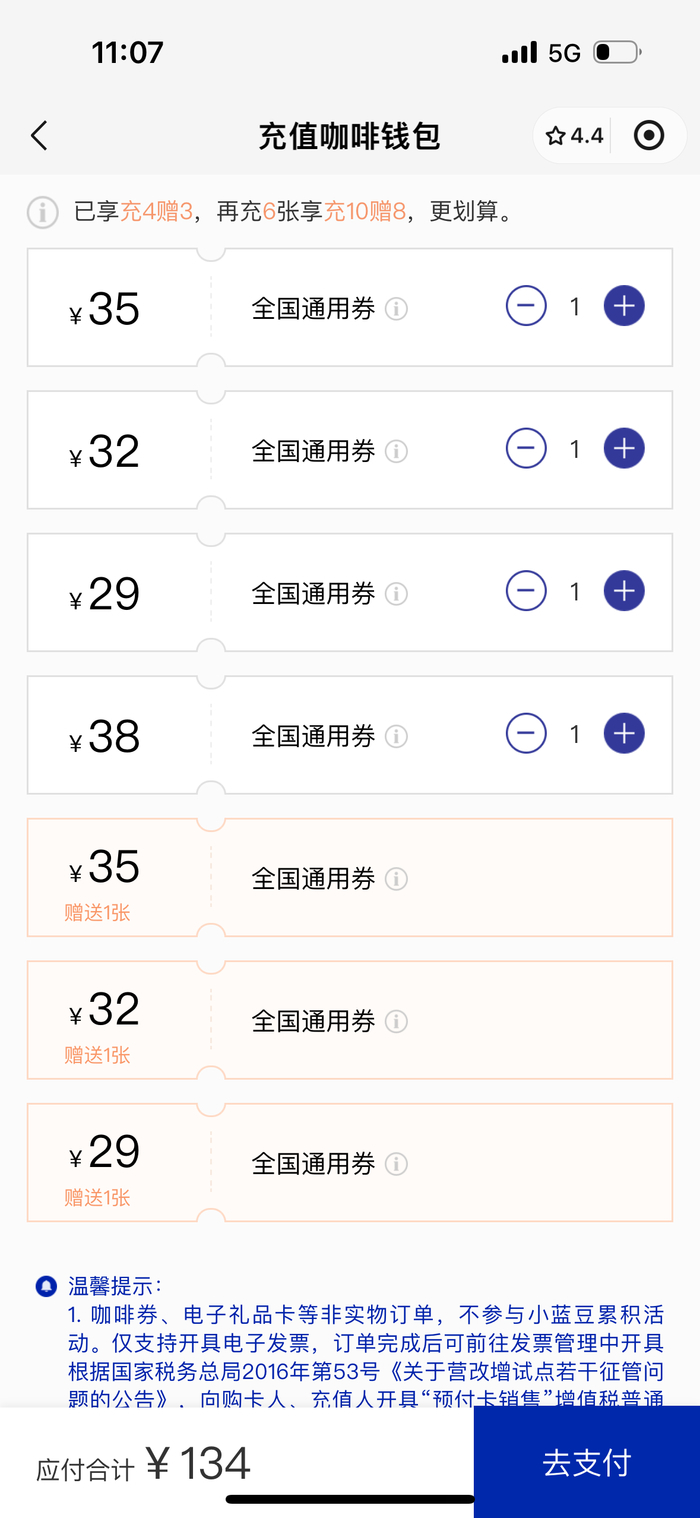 记者经计算发现,假如购买官方推出的4种不同价格的全国通用券参与“充4赠3”的活动,可得到赠送的35元、32元、29元三张券,合算下来支付134元,共得到七张券,总价值230元,相当于合计优惠五八折。据工作人员介绍,在实际消费时是按照购买的通用券的面值去抵扣的,且一张抵一杯,不找零但超额补差价。记者浏览瑞幸咖啡小程序和APP发现,瑞幸推出的产品中,冰镇杨梅瑞纳冰面价最高38元,但每款产品的到手价平均都在十几元,不用券反而更实惠。